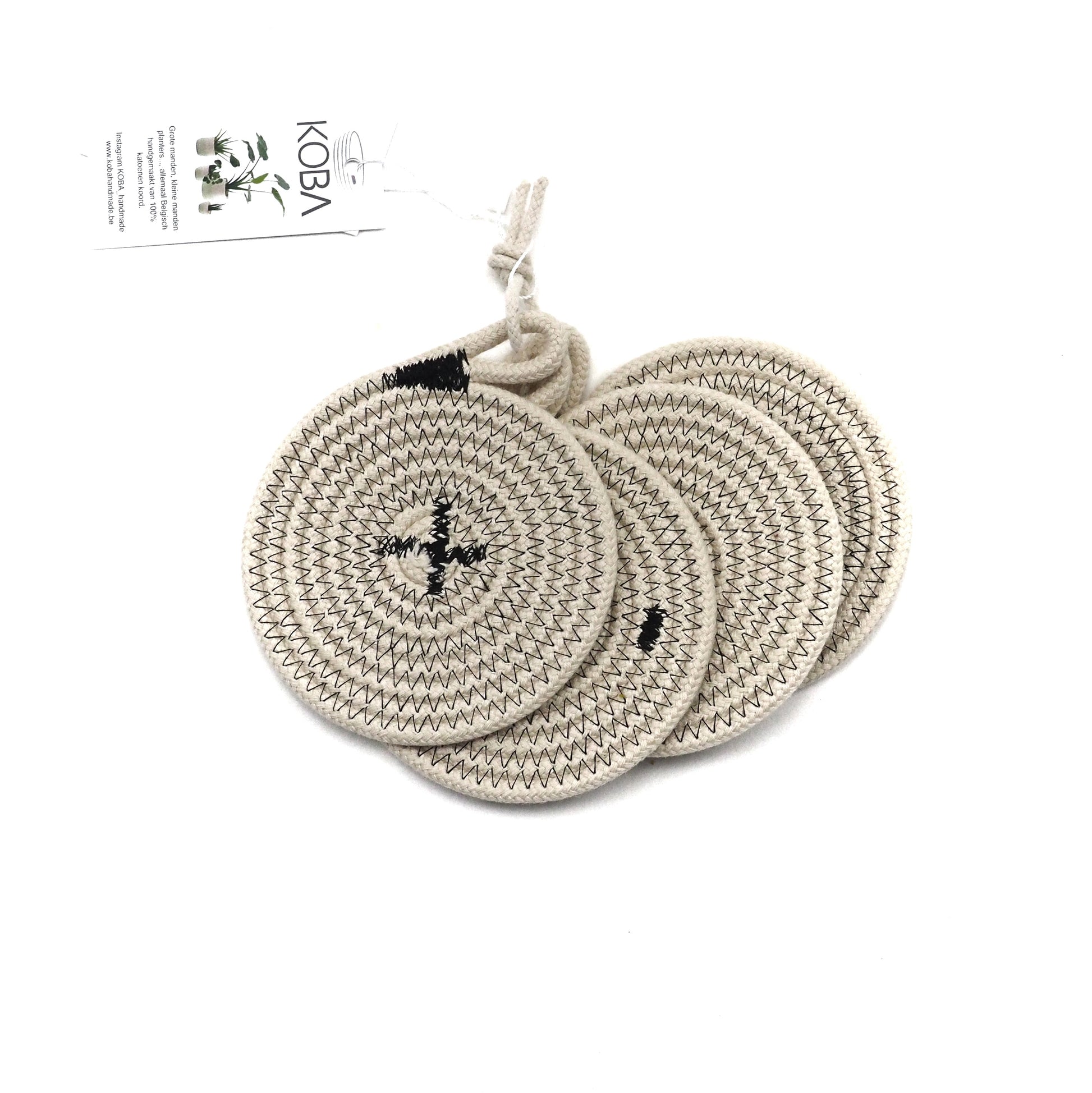 The coaster are made exclusively of high quality, Belgian produced cotton cord. A single long piece is used to create and shape each bowl, using a simple zigzag stitch.