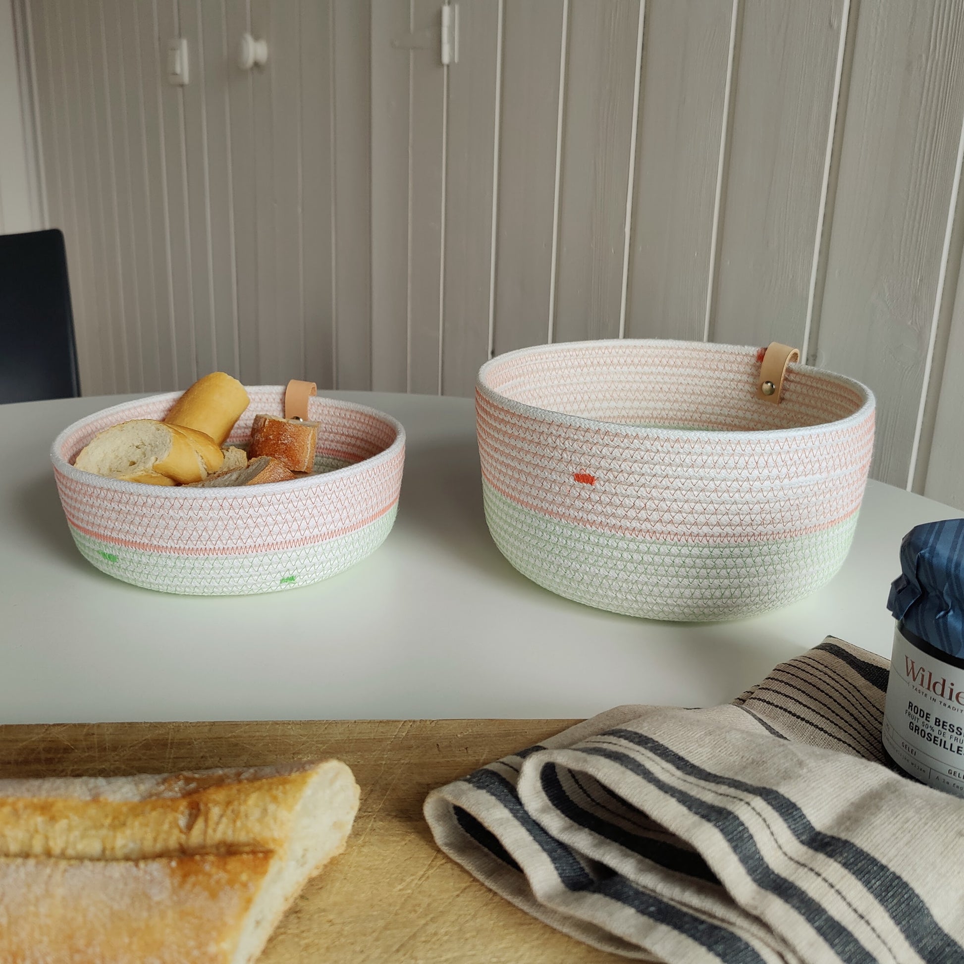 Soft Stitch baskets can be machine washed because they don’t contain leather parts or metal rivets, and the rope is knitted instead of braided, which makes it softer and more flexible.
